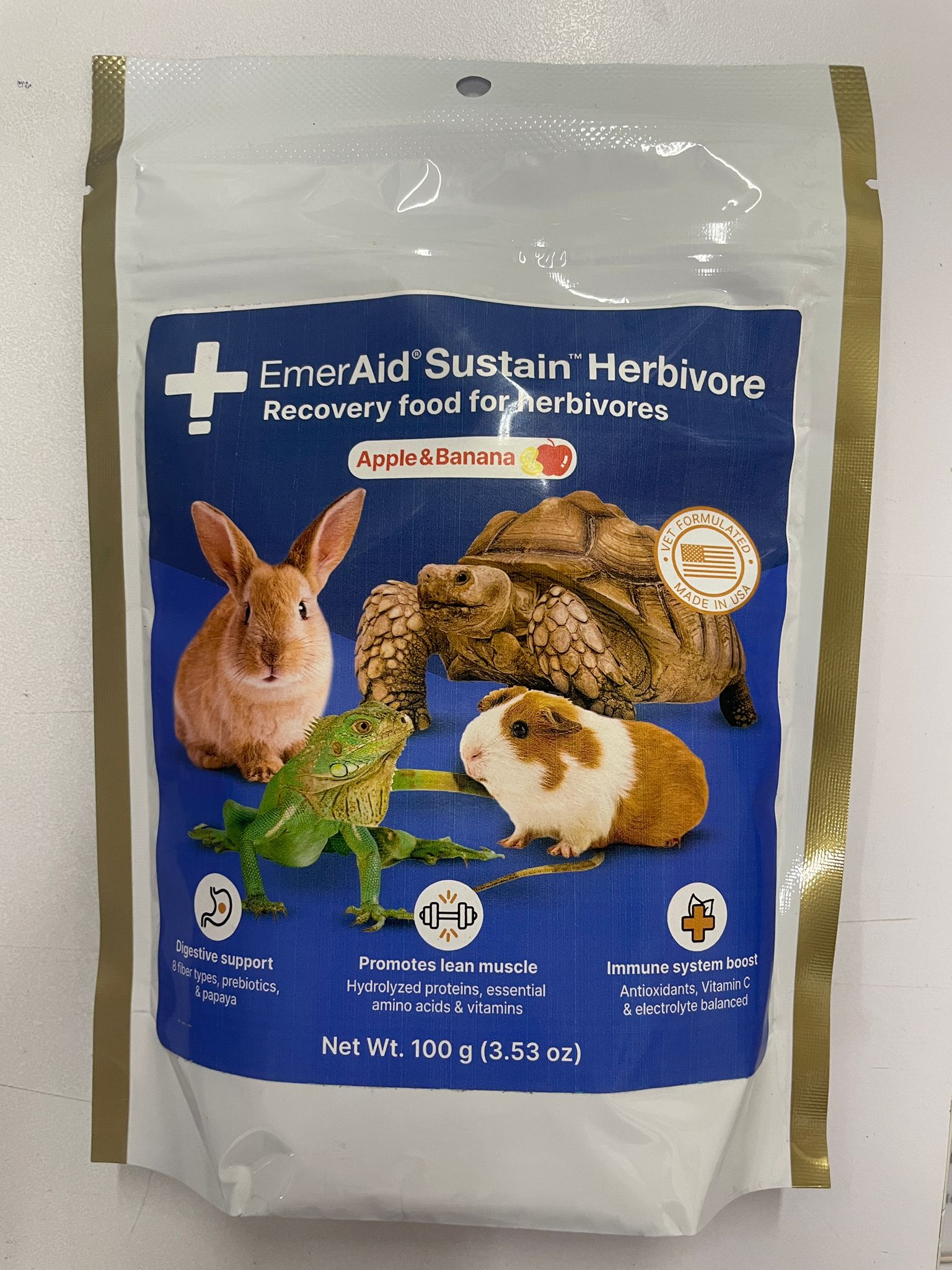 EmerAid Sustain Herbivore 是一款高纖維恢復型草食動物營養食品。體重過輕的草食動物、重病復健中的患者或患有慢性疾病的動物均可選擇這款治療性飲食。 Sustain Herbivore 也旨在幫助體弱的草食動物從重症監護營養過渡到正常飲食。作為恢復型飲食,EmerAid Sustain Herbivore 比EmerAid Intensive Care Herbivore含有更豐富的營養成分。這款治療性飲食由包括稀有動物獸醫、急診和營養師在內的專家小組研發,易於吸收和消化。 EmerAid 為粉劑配方,可視需要與水混合,透過飼管或註射器餵食。